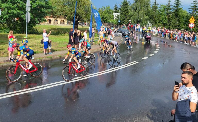 Tłum ludzi zgromadził się przed Centrum Tradycji i Kultury w Komornikach, by obejrzeć przejazd uczestników kolarskiego wyścigu Tour de Pologne. Start nastąpił na terenie Targów,