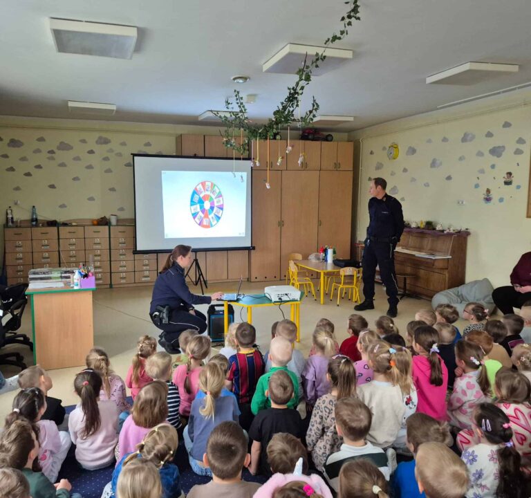 W Przedszkolu Samorządowym „Wesoła Kraina” w Wirach odbyło się wyjątkowe spotkanie edukacyjne z udziałem przedstawicieli policji, Straży Gminnej oraz członka Gminnej Komisji Rozwiązywania Problemów Alkoholowych