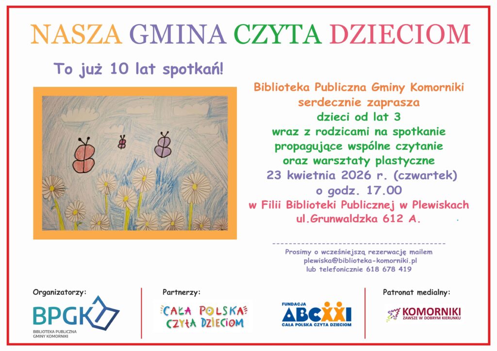 - Ogłoszenie wyników nastąpi w Bibliotece w Plewiskach podczas spotkania Nasza Gmina Czyta Dzieciom 14 maja 2026 roku.