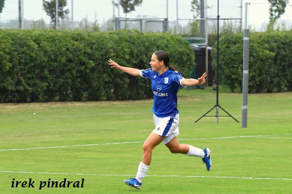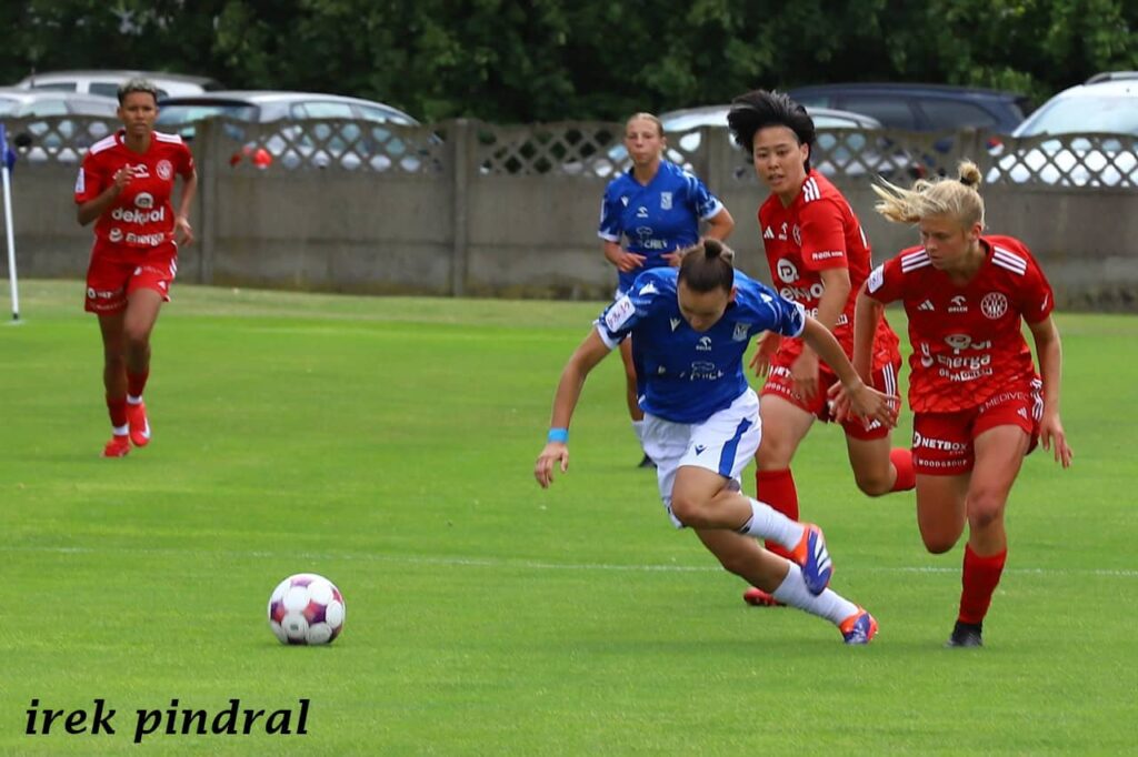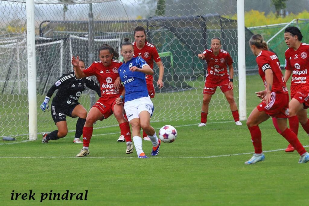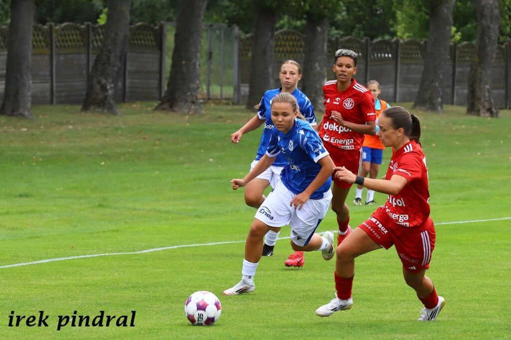 Piłkarki Lecha wygrały drugi już swój mecz w Plewiskach, tym razem 3:1. Znów bohaterką drużyny została niewielka wzrostem, ale wielka duchem Julia Przybył. Początkowo mecz toczył się pod dyktando gości. Piłka rozgrywana była głównie na połowie Lechitek. Przed stratą gola musiała je ratować bramkarka Jagoda Sapor, parując mocny i celny strzał z dystansu. Po zmoczeniu boiska przez deszcz gra zrobiła się szybsza i uwidoczniła się przewaga Kolejorza. Krótko przed przerwą, identycznie jak w poprzednim spotkaniu w Plewiskach, gola zdobyła Julia Przybył, wykorzystując niezdecydowanie bramkarki, posyłając piłkę obok niej.