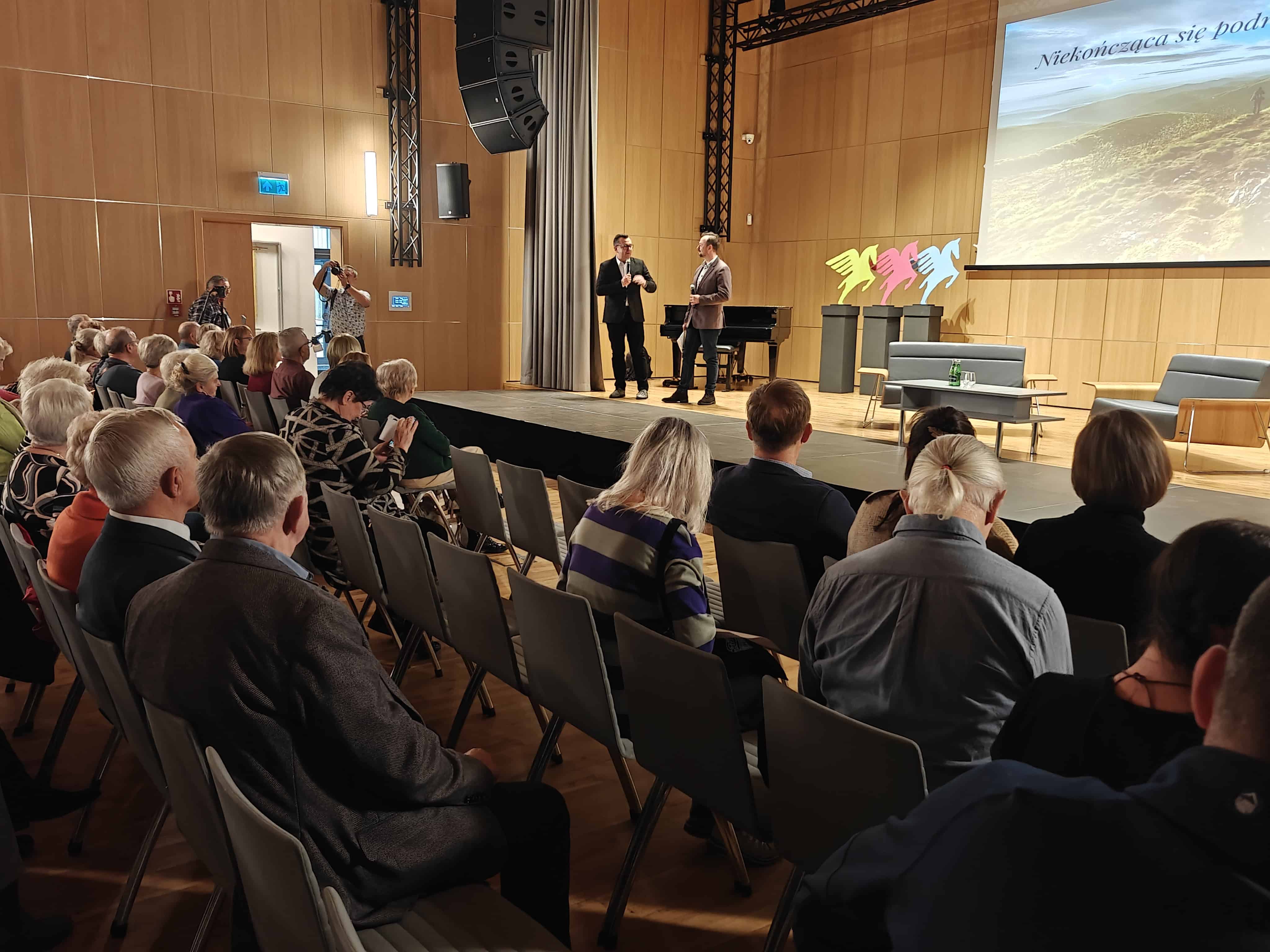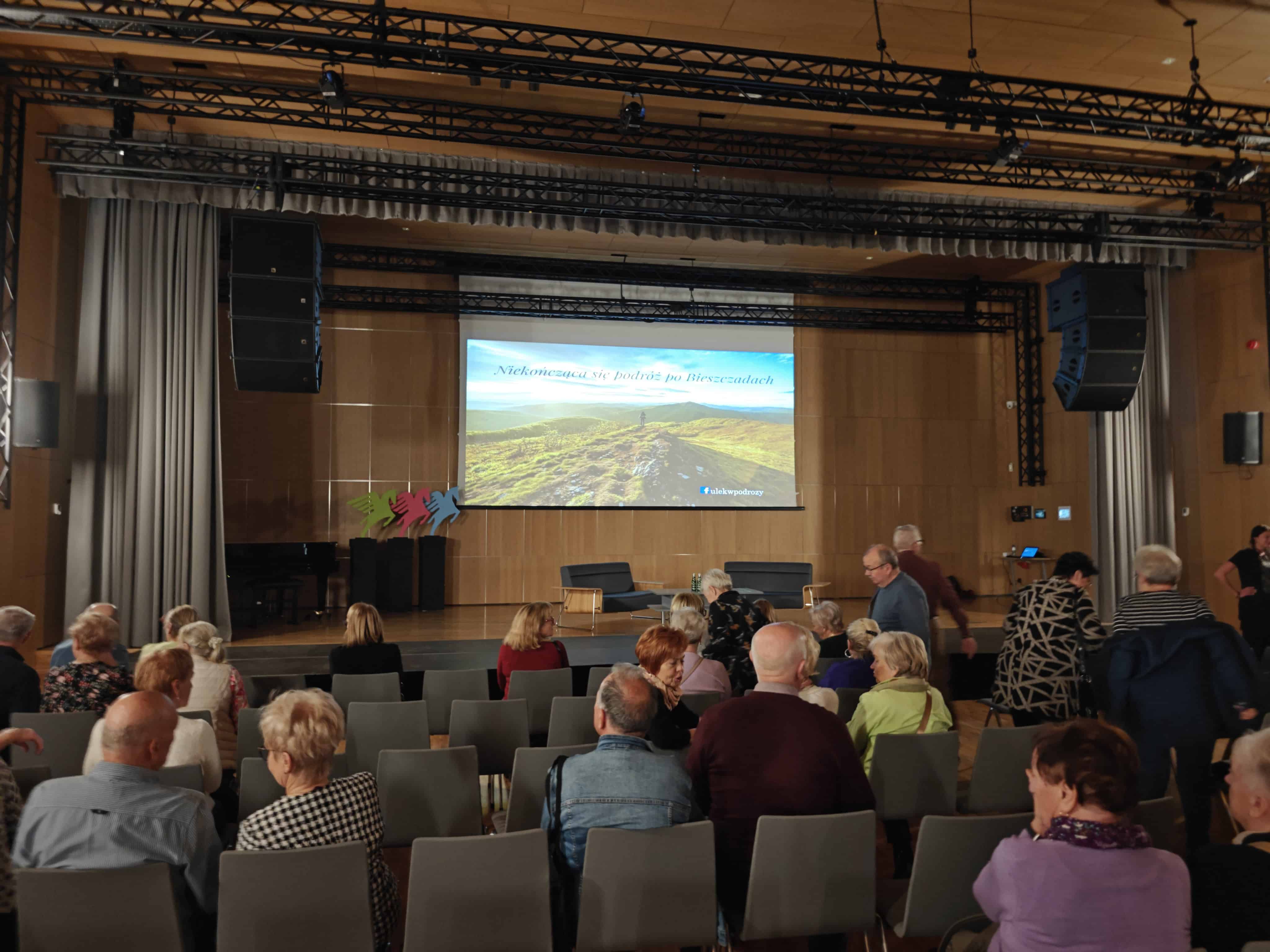 Liczną publiczność przyciągnęło organizowane w sali widowiskowej spotkanie z podróżniczką. Opowiadała o Bieszczadach, zachęcała do ich odwiedzania. Równolegle działały stoiska informacyjne ZUS, GOSiR, OPS, Promocji Gminy i Straży Gminnej, gdzie seniorzy mogli zdobyć praktyczne porady dotyczące zdrowia, bezpieczeństwa i spraw urzędowych.
