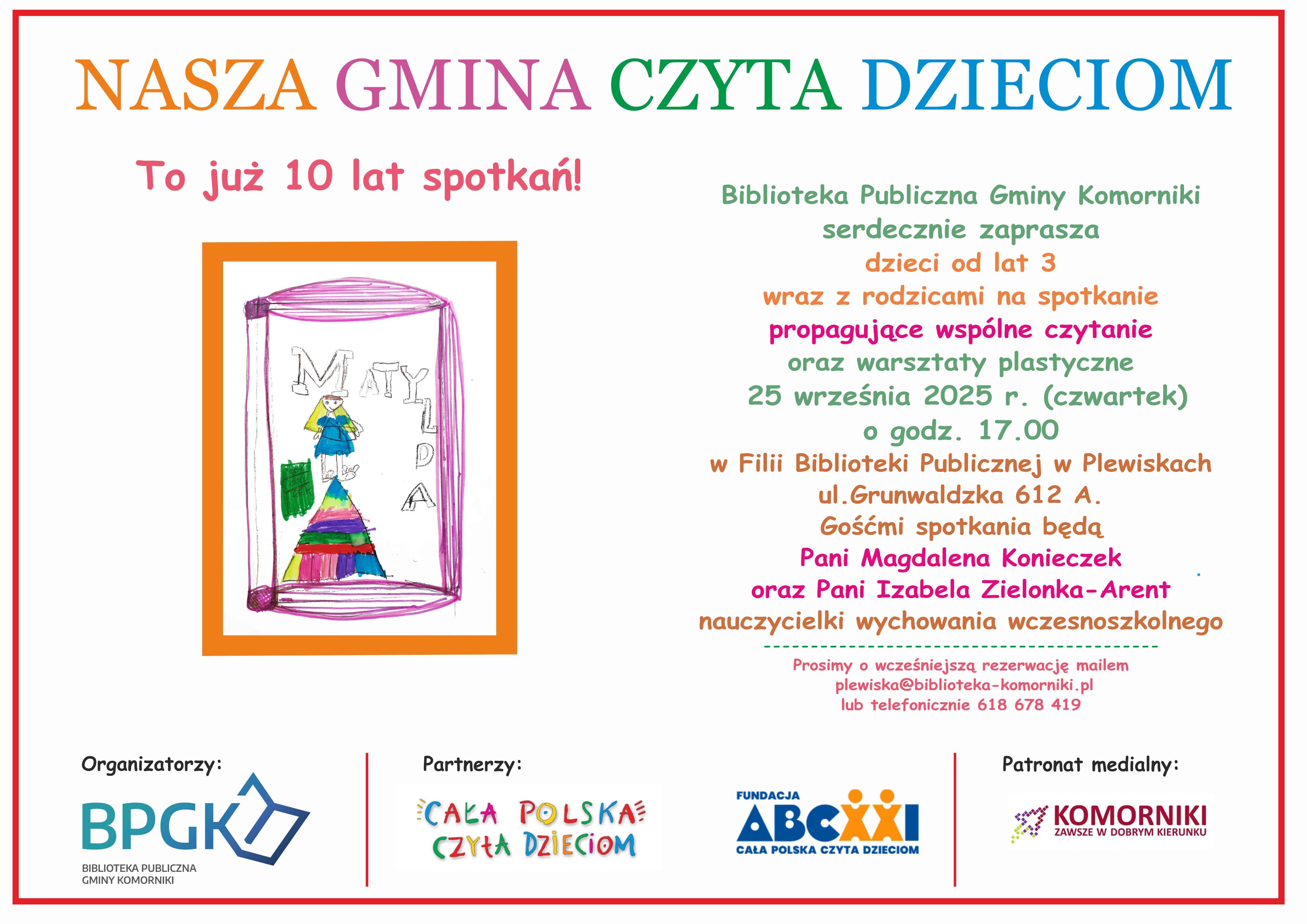 Biblioteka Publiczna Gminy Komorniki zaprasza dzieci od lat 3 z rodzicami na spotkanie propagujące wspólne czytanie oraz warsztaty plastyczne w ramach akcji Nasza Gmina Czyta Dzieciom.