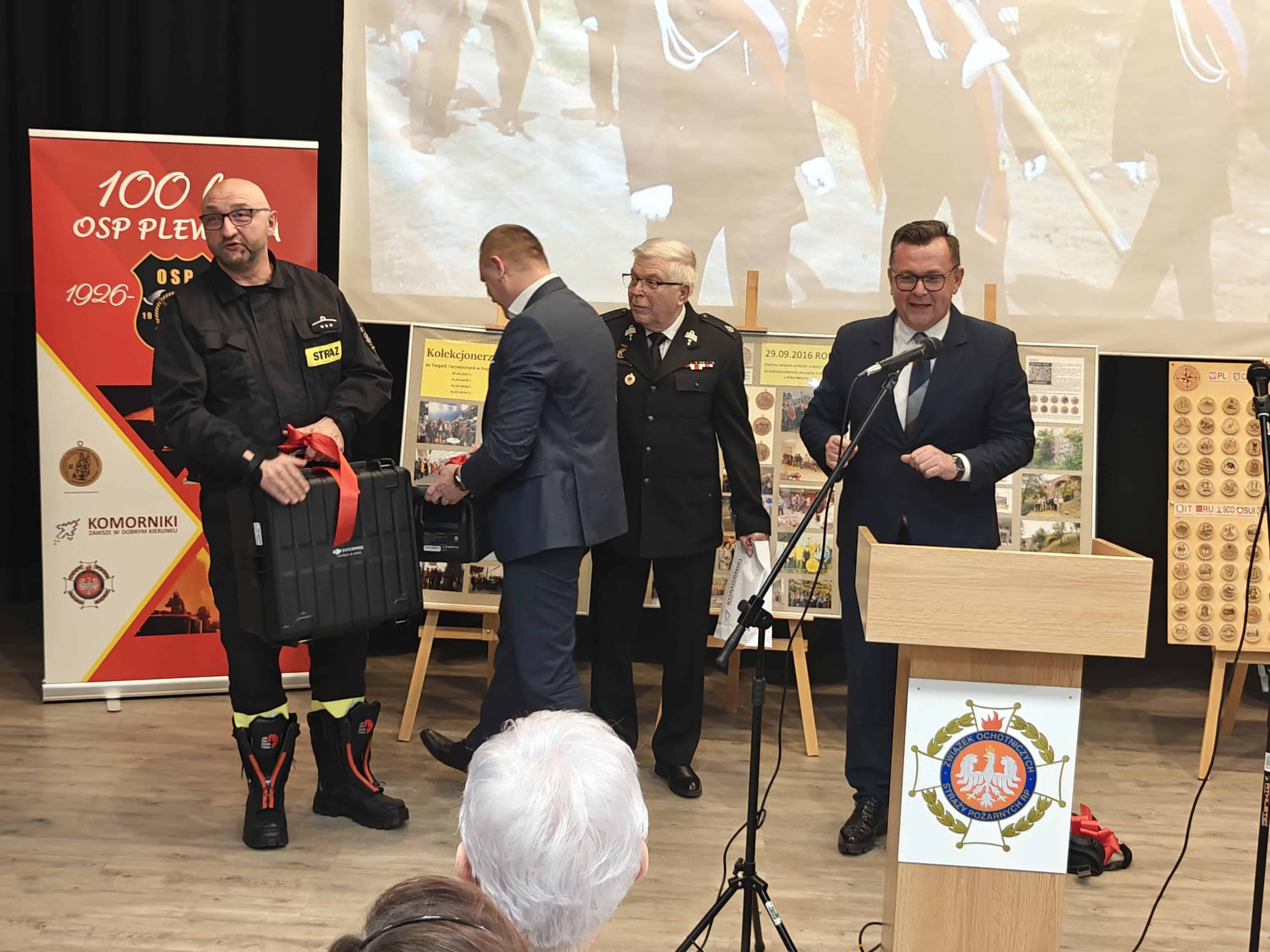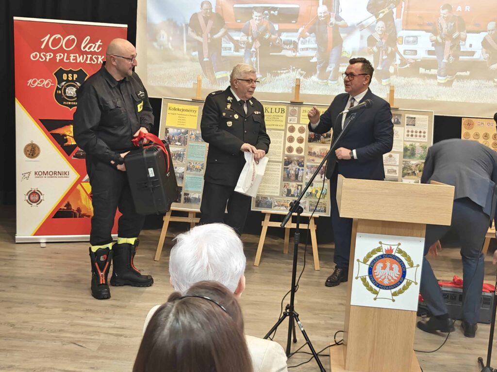 Równie ważnym momentem jubileuszu była krótka prelekcja dr Michała Hirscha. Pozwoliła ona na podróż przez sto lat działalności OSP Plewiska. Początki działalności jednostki były skromne, gdyż strażacy dysponowali jedynie podstawowym wyposażeniem, niewystarczającym przy większych pożarach. Okres II wojny światowej i pierwsze lata powojenne przyniosły zawieszenie działalności, jednak już w 1947 r. jednostka została reaktywowana. Początkowo, funkcjonując w starej kuźni, stopniowo odbudowywała swój potencjał. I faktycznie, przez kolejne dekady OSP Plewiska systematycznie się rozwijała. Obecnie jest jedną z największych jednostek w poznańskim powiecie. Dysponując aż pięcioma wozami bojowymi oraz nowoczesnym sprzętem, w tym również dronem od władz gminy (w trakcie uroczystości wójt i jego zastępca przekazali go naczelnikowi Robertowi Kuraszowi), strażacy mierzą się z ograniczeniami obecnej remizy. Z tego względu w 2025 r. podjęto decyzję o budowie nowej siedziby OSP, zapewniającej odpowiednie i nowoczesne zaplecze techniczne.