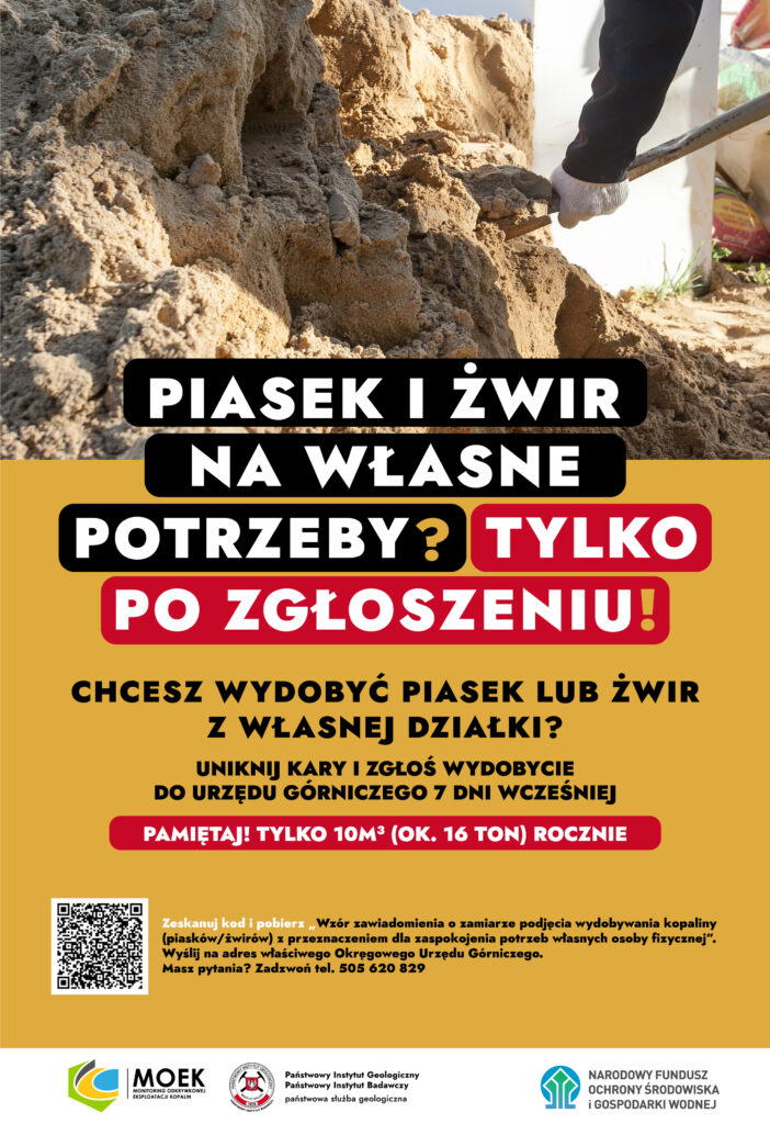 Chcąc wydobywać na własne potrzeby, z własnej posesji, piasek i żwir, trzeba to zgłosić. Szczegóły na plakacie.